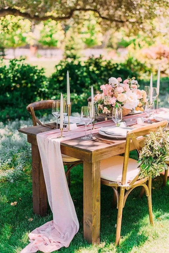 Long, flowy table runners create a seamless connection between the natural surroundings and your reception.